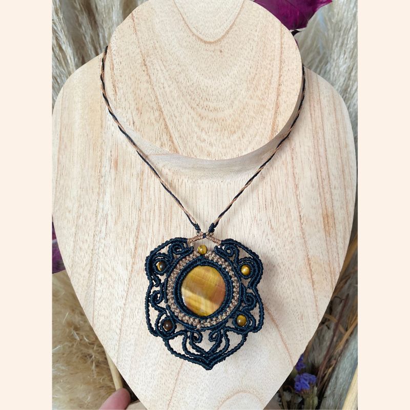 ✨ Collier mandala en micro-macramé fait main, tissé en fil noir résistant à l’eau. Orné d’une pierre naturelle d’Œil de Tigre, symbole de protection, de confiance et de force intérieure. Un bijou unique qui allie élégance et énergie positive. ✨